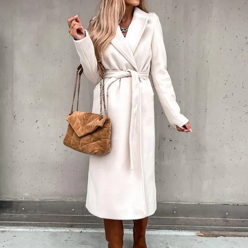 This warm, oversized coat exudes an elegant and sophisticated style, featuring a tie front and a suit collar.